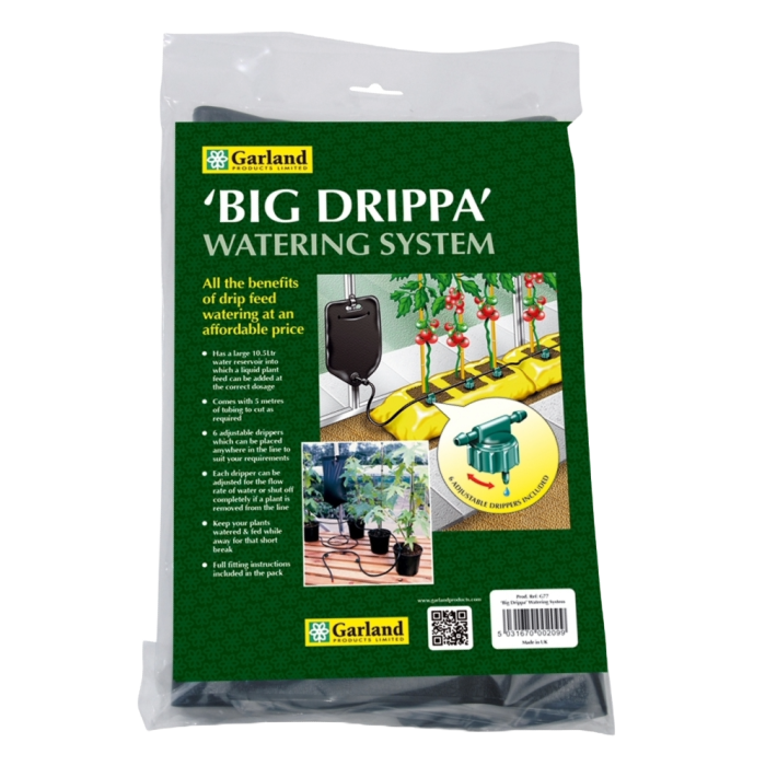 Ein durch Schwerkraft gespeistes Bewässerungssystem, das die Vorteile der Tropfbewässerung zu einem niedrigen Preis bietet. Da das Big Drippa ein in sich geschlossenes System ist, eignet es sich ideal für den Einsatz in Gebieten, in denen es keine Wasserversorgung gibt. Das System, das oft mit einem Krankenhaus-Infusionsset verglichen wird, besteht aus einem 10,5-Liter-Wasserreservoir, 5 Metern Bewässerungsschlauch und 6 verstellbaren Tropfern.
