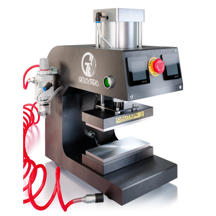 Die Graveda Graspresso GP40-5 ist eine vollautomatische pneumatische Rosin Press, die mit einem handelsüblichen Kompressor betrieben wird. Ausgestattet mit einem 5-Tonnen-Zylinder und einem regulierbaren Drucksystem per Druckminderer, liefert sie punktgenaue Ergebnisse bei der Extraktion von Budder, Shatter, Live Rosin und mehr. Das robuste, langlebige Design und die einfache Bedienung über ein Touchpanel machen sie zum idealen Werkzeug für Rosin-Enthusiasten und Profis.