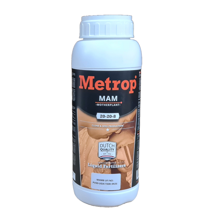 Mit der Metrop MAM Biominerals Mutterpflanzenernährung machen Sie die Mutterpflanzen stark und länger haltbar, so dass die Stecklinge auch stark und länger haltbar sind. Metrop MAM ist zusammen mit dem Metrop Calgreen und dem AminoXtrem eine 3-gliedrige Pflanzennährstofflinie, die es sehr einfach macht, starke Mutterpflanzen für lange Zeit mit so wenig Stress wie möglich zu produzieren.