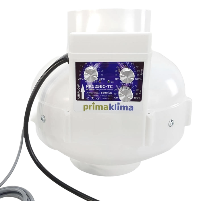 Der neue EC-Ventilator aus den Hause Prima Klima, der EC-Ventilator wird mit einem Regler geliefert der bereits verbaut ist. Die EC-Motoren haben den Vorteil das Sie im Verhältnis zu den AC-Motoren ein deutlich höhere Förderleistung erbringen mit einer niedrigeren Watt zahl verbrauchen, nicht nur die Förderleistung ist besser, sondern auch der Druck des Lüfters ist wesentlich höher als bei den normalen AC-Motoren. Der Regler bietet den Vorteil dass man noch mehr Strom sparen kann wenn der Lüfter nicht auf Volllast laufen muss.
