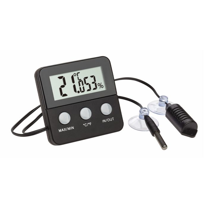 Das digitale Thermo-Hygrometer misst über zwei separate Kabelfühler Temperatur und Luftfeuchtigkeit. Mit Saugnäpfen lassen sich die Fühler ganz leicht an den Scheiben des Terrariums anbringen – und zur Reinigung ebenso leicht wieder abnehmen.